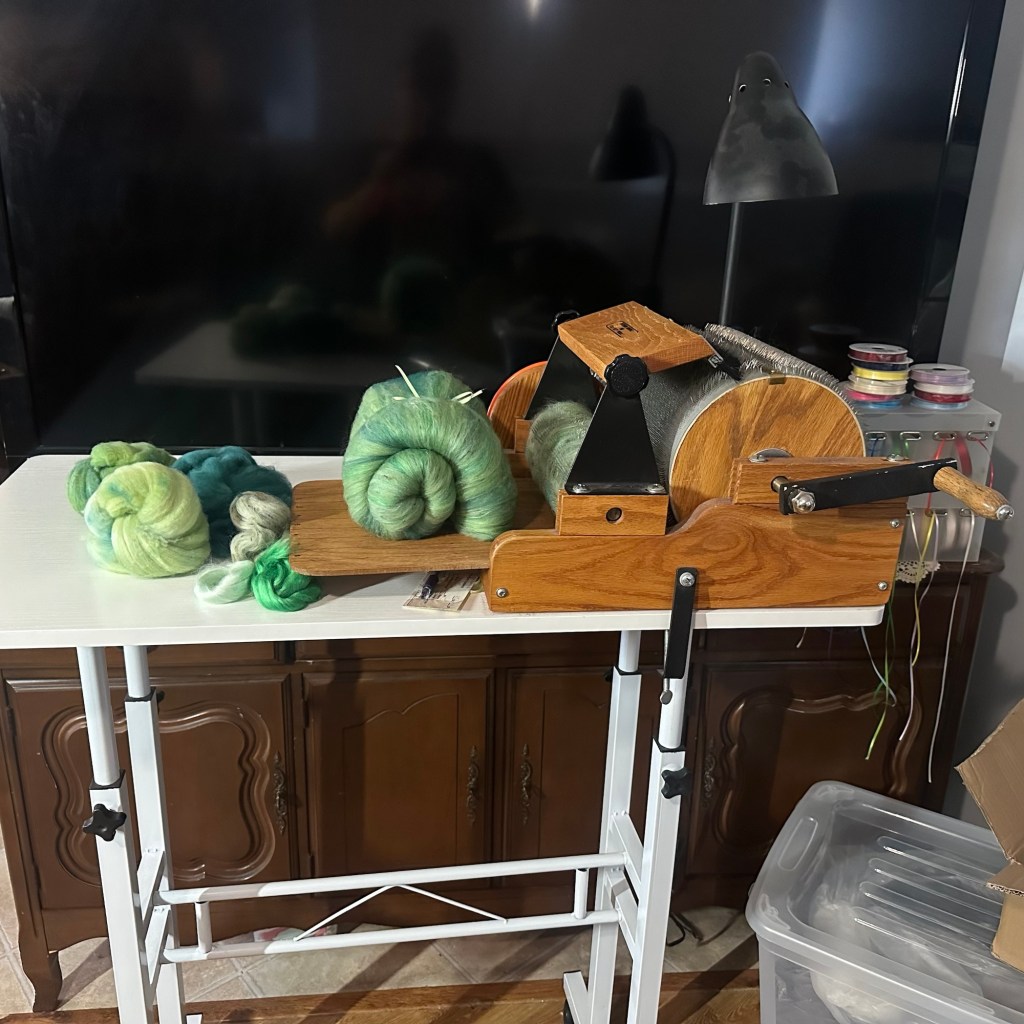 Well that’s enough traversing memory lane! I need to get back to carding batts! This is how they look before they hit the carder, each Fibre carefully measured to the gram with cards carefully written out so you know each toy what you are getting!